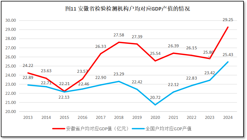 由图11可见,过去12年,安徽省检验检测机构户均对应的GDP值呈现先降后升再降的W型曲线,从2013年的24.22亿元下降到2015年的22.21亿元,再增长到2018年的27.58亿元,此后逐步下降,到2023年为25.8亿元,然后2024年出现大幅提升,达到29.25亿元,创下历年新高。从安徽省户均对应GDP的值与全国情况进行比较可见,安徽省的数值一直比全国平均数要高,2024年度的差距有所增大。安徽省的数据变化趋势表明,相对安徽省经济总量的快速增长,近年来安徽省检验检测机构数量增长不多,2024年还出现了机构数量大幅下降的情况,检验检测市场供需失调的矛盾有一定缓解。