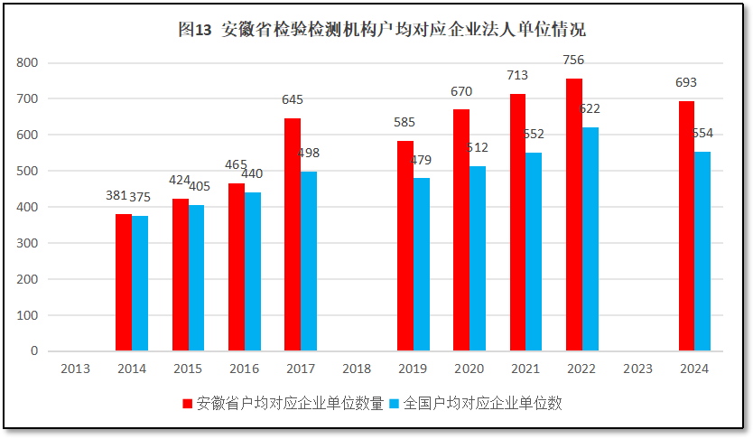 由图13可见,12年来,安徽省检验检测机构户均对应的企业法人单位数量逐年增加,增幅稳定且一直比全国平均数要高。2024年安徽省检验检测机构户均对应企业法人单位693个,比全国平均数554个高出139个。