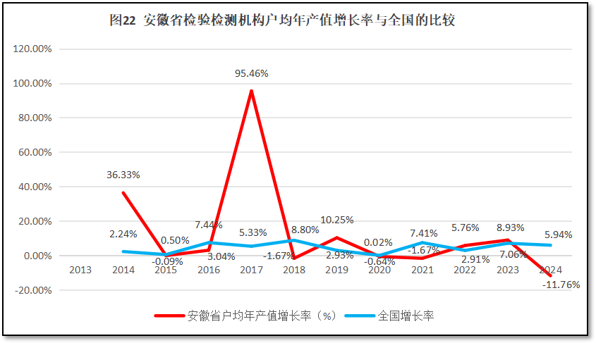 再来看安徽省检验检测机构人均年产值增长率与全国人均年产值增长率的比较,如图19所示。