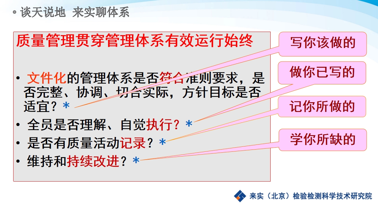 本次电竞牛聊体系的主要内容,徐老师主要谈谈实验室管理体系如何能够有效运行,指出了十六字方针,供大家参考学习。